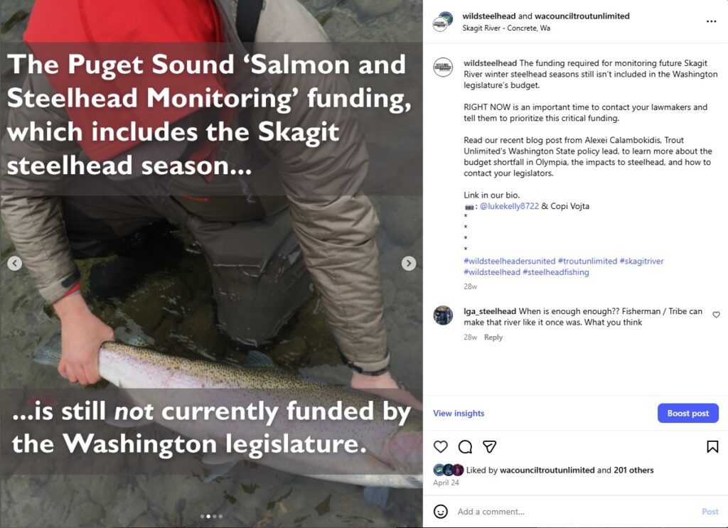 Now, we’re working with our grassroots to carry a critical message to Washington legislators: The Skagit winter/spring fishery, and the Puget Sound Salmon and Steelhead Monitoring that makes it possible, not only needs to be reinstated as soon as possible, they need a permanent source of funding so this essential work isn’t at risk going forward.